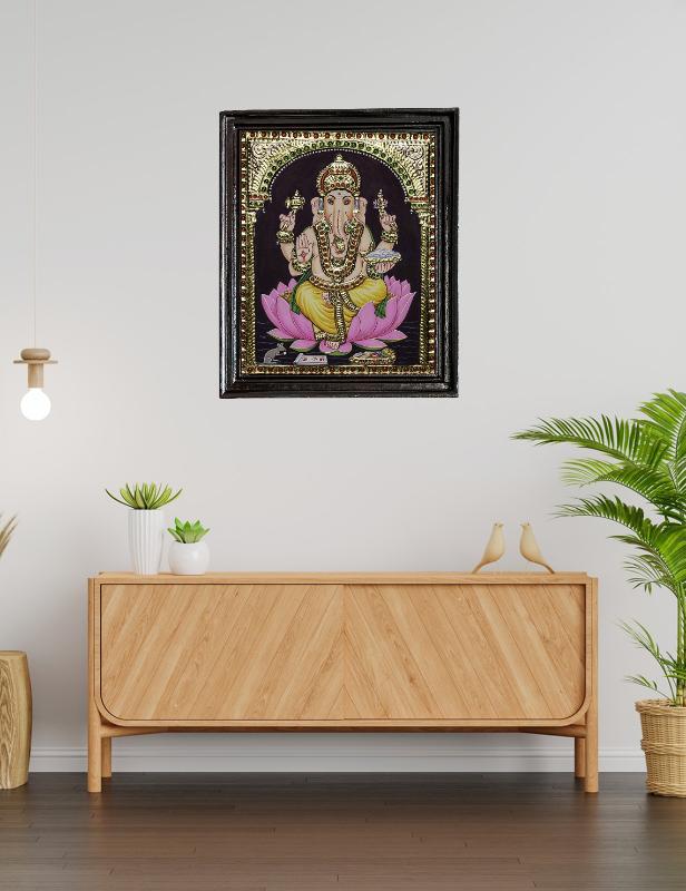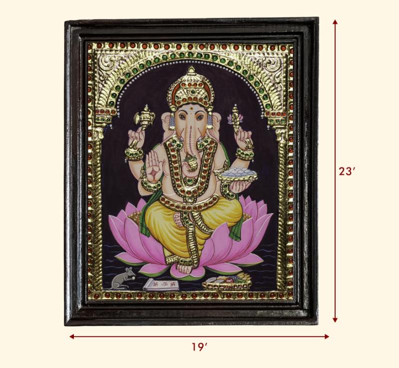 Seated on the lotus bloom so bright, Pillaiyar’s smile, a radiant light. With gentle hands and wisdom’s grace, He clears the path, each time and place. In this painting’s golden gleam, He guards our hopes and dreams supreme.